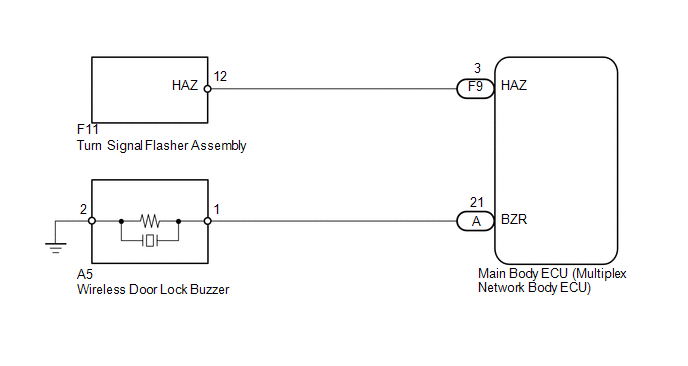 In some cases, the wireless door lock control functions are normal but the hazard warning light and/or wireless door lock buzzer answer-back function(s) does not operate. In such cases, hazard warning light and wireless door lock buzzer signal outputs from the main body ECU or certification ECU may be malfunctioning.