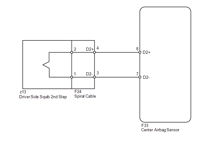 The driver side squib 2nd step circuit consists of the center airbag sensor, spiral cable and steering pad.
