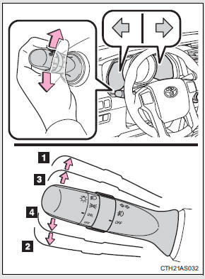 1. Right turn 2. Left turn 3. Lane change to the right (push and hold the lever partway) The right hand signals will flash until you release the lever.